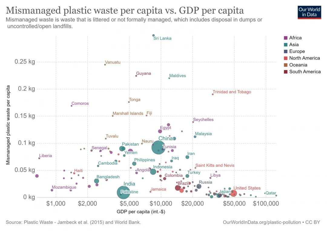 管理不善的塑料垃圾與人均GDP的關系。