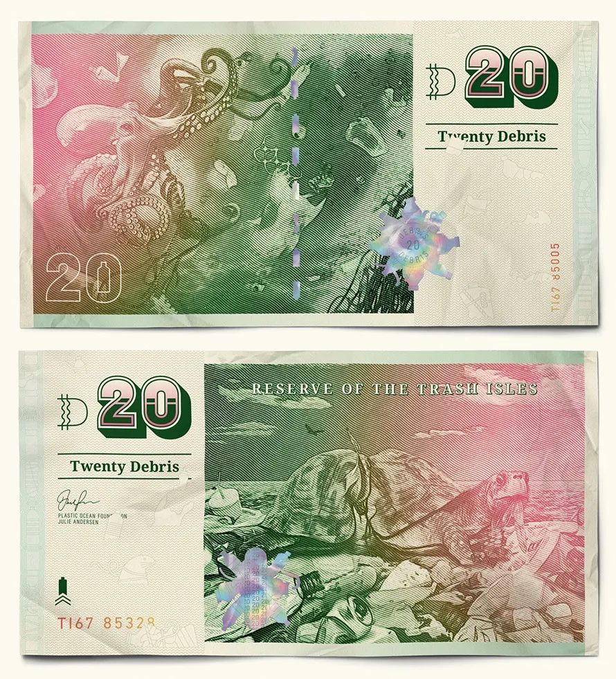 比如20元的貨幣圖案是章魚與塑料垃圾和被塑料纏住的海龜;