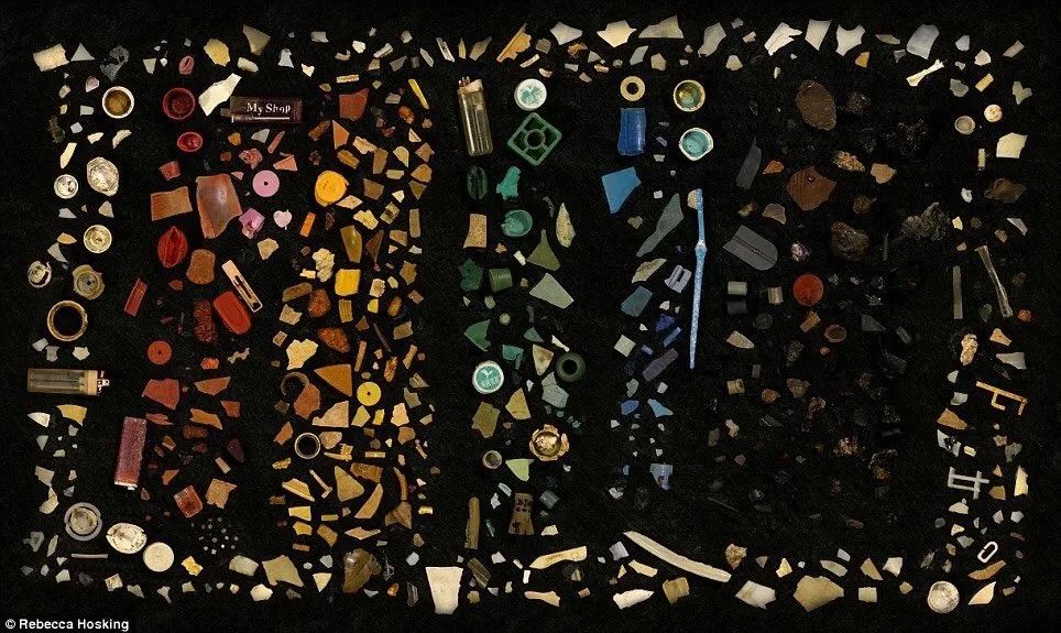 仔細一看,原來這是一張由牙刷、瓶蓋等塑料制品組成的拼圖,這些牙刷、瓶蓋都是從一只死亡的幼年信天翁腹內(nèi)取出的。