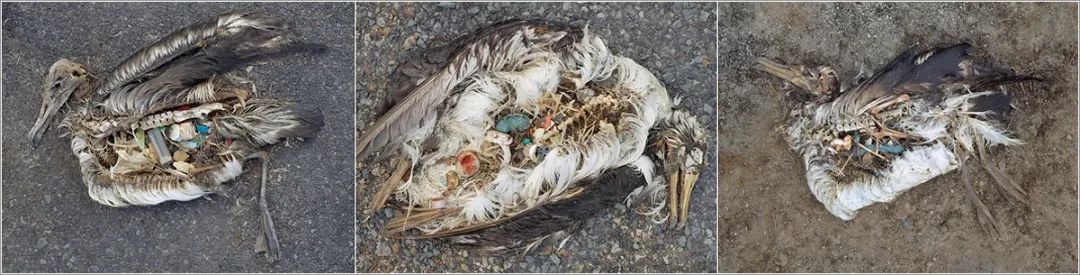 他們的團隊拍攝到了成千上萬只死在地上的年輕信天翁,它們的胃里裝滿了塑料。