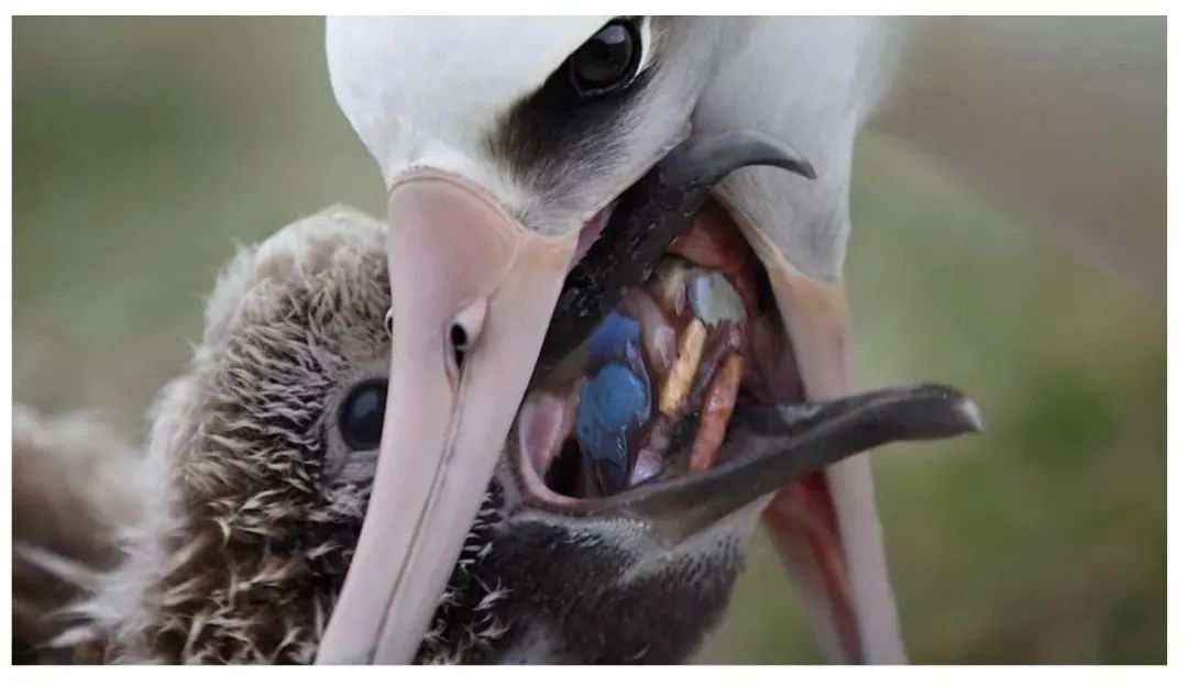 當海鳥媽媽不遠千里從海洋上帶回來食物,也就是撿拾來的塑料片直接就會喂給小海鳥,餓得發(fā)慌的小海鳥迫不及待地咬上一口,咬不動,又吐出來;于是海鳥媽媽就用嘴將塑料片啄碎,再一片一片喂給小海鳥。