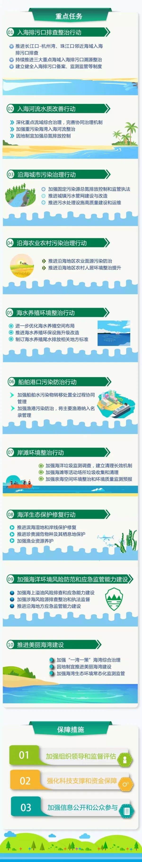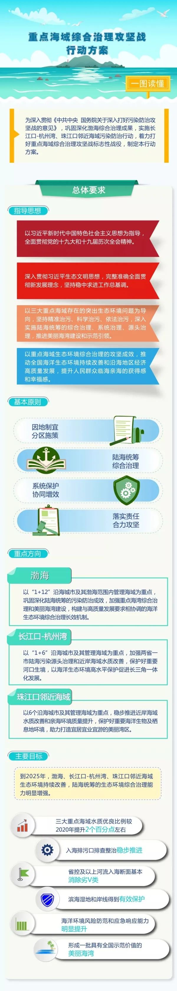 《重點海域綜合治理攻堅戰(zhàn)行動方案》提出開展:入海排污口排查整治行動、入海河流水質(zhì)改善行動、沿海城市污染治理行動、沿海農(nóng)業(yè)農(nóng)村污染治理行動、海水養(yǎng)殖環(huán)境整治行動、船舶港口污染防治行動、岸灘環(huán)境整治行動、海洋生態(tài)保護修復(fù)行動等“七大行動”。