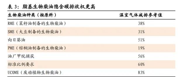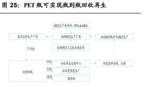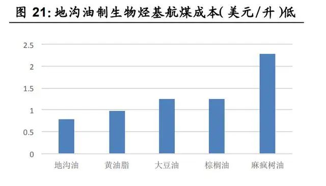 再生油:碳約束推動(dòng)需求高增,再生地溝油產(chǎn)業(yè)升級(jí)將至碳約束推動(dòng)需求高增,再生地溝油產(chǎn)業(yè)升級(jí)將至。1)碳約束刺激再生油需求,歐洲生物柴油量價(jià)將長期處于高位。2)國際政策推動(dòng)國內(nèi)地溝油利用“高端化”:車用油方面,“烴基化”趨勢明顯;航油方面,國際航協(xié)2050碳中和目標(biāo)推動(dòng)生物質(zhì)烴基航煤需求釋放。地溝油制烴基柴油附加值將較UCOME顯著提升,再生地溝油向著高端產(chǎn)品升級(jí)的產(chǎn)業(yè)趨勢明顯。1. 碳約束刺激需求,歐洲生物柴油量價(jià)將長期處于高位歐洲生物柴油需求旺盛,量價(jià)將長期處于高位。1)歐盟是全球生物柴油最大的消費(fèi)市場,目前歐盟生物柴油消費(fèi)量占全球總消費(fèi)量的 40%。2)發(fā)達(dá)國家強(qiáng)制按比例添加:伴隨《歐盟可再生能源指令》于2021年開始實(shí)施,歐洲公路運(yùn)輸行業(yè)的生物柴油摻混比例將從 10%提升至25%,需 求將在未來10年保持增長態(tài)勢。按照目前全球生物柴油產(chǎn)能計(jì)算,到2030年歐洲地區(qū)將至少出現(xiàn)1000萬噸/年的供給缺口;如果考慮美國拜登政府改變碳減排政策帶來的需求增加以及歐洲地區(qū)淘汰ILUC高風(fēng)險(xiǎn)燃料的影響,總體供給缺口將達(dá)1500萬噸/年。3)廢油脂基生物柴油(UCOME)隱含碳排放權(quán)更高,節(jié)碳效果最為突出,競爭優(yōu)勢明顯,長期處于供不應(yīng)求狀態(tài)。2. 國際政策推動(dòng)國內(nèi)地溝油利用“高端化”,產(chǎn)業(yè)升級(jí)將至目前我國地溝油資源化終端產(chǎn)物主要以脂肪酸甲酯為主,隨著國際政策驅(qū)動(dòng)以及地溝油脫氧加氫制先進(jìn)燃料生物烴基柴油/航煤技術(shù)進(jìn)入成熟階段,我國地溝油資源化終端產(chǎn)品將由脂肪酸甲酯產(chǎn)品向生物質(zhì)烴基柴 油/航煤升級(jí),產(chǎn)品附加值將逐步提升,產(chǎn)業(yè)升級(jí)良機(jī)將至。地溝油經(jīng)加工再利用而制備的生物質(zhì)燃料,包括生物柴油、可再生柴油以及生物質(zhì)航煤:1)生物柴油是廢油脂或動(dòng)植物油脂經(jīng)酯交換或酯化制成的脂肪酸甲酯(FAME),需要與常規(guī)化石柴油摻混使用, 目前我國地溝油資源化終端產(chǎn)物主要以脂肪酸甲酯為主(UCOME);2)可再生柴油是廢油脂或動(dòng)植物油脂通過加氫和異構(gòu)化得到的烴基柴油(HVO/HEFA),為國際認(rèn)可的先進(jìn)生物燃料,可完全替代化 石柴油或與化石柴油制成調(diào)和燃料;3)生物質(zhì)航煤是由廢油脂經(jīng)加氫處理得到 HEFA 后,經(jīng)異構(gòu)化生成。國際政策推動(dòng)國內(nèi)地溝油利用“高端化”:1)車用油“烴基化”趨勢明顯。未來伴隨歐洲對(duì)于添加比例、排放標(biāo)準(zhǔn)等約束趨嚴(yán),車用油面臨“烴基化”趨勢,生物柴油將向著可再生柴油方向升級(jí)。2) 國際航協(xié) 2050碳中和目標(biāo)推動(dòng)生物質(zhì)烴基航煤需求釋放。國際航協(xié)設(shè)立2050年實(shí)現(xiàn)碳中和的強(qiáng)制性目標(biāo),生物質(zhì)航煤作為主要減 排手段需求量將攀升。①作為高排放行業(yè)之一,2019年航空業(yè)占全 球碳排放量的 2%。②國際航協(xié)(IATA)于 2021 年 10 月通過決議, 290 個(gè)成員航司在 2050 年實(shí)現(xiàn)碳中和,助力實(shí)現(xiàn)巴黎協(xié)定控制溫升 的目標(biāo)。計(jì)劃減排量相當(dāng)于 2050 年前累計(jì)減排 212 億噸二氧化碳 當(dāng)量。③現(xiàn)有技術(shù)中,生物質(zhì)航煤為主的環(huán)保航空燃料將為主要的 減排手段,環(huán)保燃料預(yù)計(jì)貢獻(xiàn) 65%碳減排量。IATA 初步目標(biāo)為, 2025 年環(huán)保航空燃料產(chǎn)量由 2019 年的 1.4 億升提升至 79 億升, IEA 測算全球生物質(zhì)航煤的產(chǎn)量在 2021 至 2026CAGR77%。以地溝油等廢油脂作為原材料的生物烴基航煤(HFEA)目前已技術(shù)成熟、成本相對(duì)較低、得油率較高。1)HFEA 作為目前唯一進(jìn)入 商業(yè)化應(yīng)用階段的生物質(zhì)航煤技術(shù),生產(chǎn)成本為 0.88 歐元/升,為各 技術(shù)中最低,且得油率為 0.9,遠(yuǎn)高于其他技術(shù)得油率(Pavlenko et al., 2019)。2)據(jù)IRENA,地溝油生產(chǎn)生物質(zhì)烴基航煤的成本低于 大豆油、棕櫚油,根據(jù)現(xiàn)有資料測算,地溝油航煤成本僅相當(dāng)與棕 櫚油航煤的 62%,具有較強(qiáng)的成本優(yōu)勢。再生地溝油產(chǎn)品附加值將逐步提升,產(chǎn)業(yè)升級(jí)良機(jī)將至。受到成本和隱含碳稅影響,目前海外的生物質(zhì)航煤價(jià)格遠(yuǎn)高于化石航煤,生 物質(zhì)航煤的需求基本都是受到政策驅(qū)動(dòng)。據(jù) Argus media 統(tǒng)計(jì),2020 年生物質(zhì)航煤價(jià)格為化石航煤的 3-6 倍。地溝油制生物質(zhì)航煤產(chǎn)品 附加值將較 UCOME 顯著提升,再生地溝油向著高端產(chǎn)品升級(jí)的產(chǎn) 業(yè)趨勢明顯。再生塑料:政策推動(dòng)需求釋放,PET 瓶對(duì)瓶高端回收應(yīng)用替換速度超預(yù)期 回收再生利用為廢塑料的最佳處置方式。再生塑料節(jié)能減碳,為實(shí)現(xiàn)碳 中和的重要手段之一。政策驅(qū)動(dòng)全球再生塑料需求釋放,PET瓶對(duì)瓶高 端回收應(yīng)用替換速度超預(yù)期。塑料垃圾泄露到環(huán)境中難以降解帶來危害,其污染治理是世界性難題,對(duì)我國來