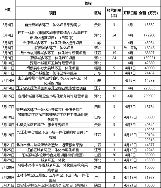 一季度末尾給二季度開了一個(gè)好彩頭,雖然3月份只開標(biāo)了18個(gè)億級(jí)環(huán)衛(wèi)項(xiàng)目,但卻有23個(gè)過(guò)億項(xiàng)目開始招標(biāo),而且這些項(xiàng)目均在4月份開標(biāo),總投資達(dá)138億!這也意味著第二季度首月已有百億項(xiàng)目將被收入囊中。