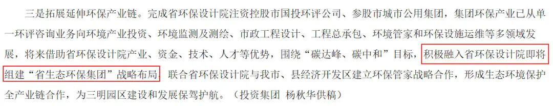 2021年8月,福建省三明市國資委網(wǎng)站發(fā)布文章《市投資集團:從三方面發(fā)力積極培育環(huán)保產(chǎn)業(yè)》中,其中提出要“積極融入省環(huán)保設(shè)計院即將組建‘省生態(tài)環(huán)保集團’戰(zhàn)略布局”。