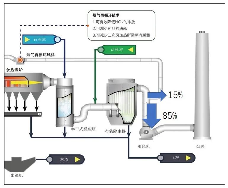 目前能夠滿足《生活垃圾污染控制標(biāo)準》(GB18485-2014)和歐盟EU2010/75/EC排放標(biāo)準的煙氣凈化處理工藝以“SNCR+半干法+干法+活性炭+袋式除塵”和“SNCR+半干法+干法+活性炭+袋式除塵+濕法”為主。但部分省市對NOx的排放標(biāo)準提出了更高的要求,如DB37/2376-2013山東省區(qū)域性大氣污染物綜合排放標(biāo)準的重點控制區(qū)域NOx限值為100mg/m3,垃圾焚燒煙氣NOx排放濃度限值低于100mg/m3成了一個趨勢。部分焚燒項目因此增加了SCR工藝以適應(yīng)更高的環(huán)保要求。主流的脫硝技術(shù)包括焚燒爐燃燒控制爐溫、煙氣再循環(huán)技術(shù)、SNCR系統(tǒng)、SCR系統(tǒng)以及ICR(PNCR)系統(tǒng),其中焚燒爐燃燒控制爐溫與煙氣回流技術(shù)可有效降低原始NOx濃度。但通常采用焚燒爐燃燒控制爐溫、煙氣回流以及SNCR脫硝系統(tǒng)的情況下,NOx排放值仍無法穩(wěn)定控制在100mg/m3以內(nèi)。針對NOx排放限值為100mg/m3的垃圾焚燒項目,目前國內(nèi)垃圾焚燒發(fā)電廠采用的脫硝工藝有SNCR+SCR系統(tǒng)以及SNCR+ICR(PNCR)系統(tǒng)。從上海環(huán)境洛陽項目應(yīng)用組合“煙氣再循環(huán)+SNCR+ICR(PNCR)”脫硝工藝后運行工況穩(wěn)定性較好,綜合成本更低。對于原先未采用煙氣再循環(huán)工藝的焚燒廠,如在引風(fēng)機前增加煙氣再循環(huán)工藝,可有效降低引風(fēng)機的電功率,利用再循環(huán)風(fēng)替代原有二次風(fēng),可實現(xiàn)引風(fēng)機的運行功率降低約10%。而且,應(yīng)用煙氣再循環(huán)工藝后,爐內(nèi)過量空氣系數(shù)降低,焚燒爐出口NOx原始濃度可降低約30%-40%,穩(wěn)定控制在200mg/Nm3以內(nèi),入爐噸垃圾尿素消耗量可節(jié)約0.5kg左右,降低系統(tǒng)運行的能耗和藥劑消耗,實現(xiàn)碳減排。