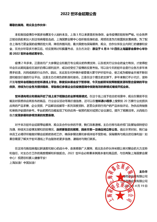 重要通知丨2022世環(huán)會(huì)展會(huì)延期,世環(huán)通服務(wù)上線!