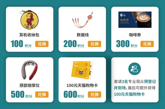 注:積分可在展會(huì)現(xiàn)場兌換天貓購物卡、頸部按摩儀、咖啡券、收納包等精美禮品