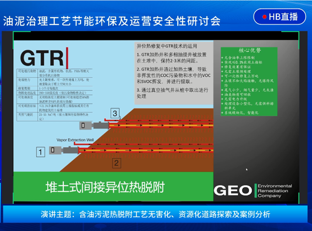 本次研討會(huì)上陳曉松博士也帶來(lái)了《含油污泥熱脫附工藝無(wú)害化、資源化道路探索及案例分析》的分享。陳博士重點(diǎn)介紹了GEO公司的堆土間接熱脫附技術(shù),堆土間接熱脫附技術(shù)也是原位脫附技術(shù)的翻版,核心技術(shù)原理上是一致的。堆土間接熱脫附技術(shù)首先會(huì)將污染土堆成一個(gè)土堆,在外圍圍上隔熱板,然后插入加熱井和抽提井,加熱井連接燃燒器及空氣,抽提井連接地表尾氣處理設(shè)備。