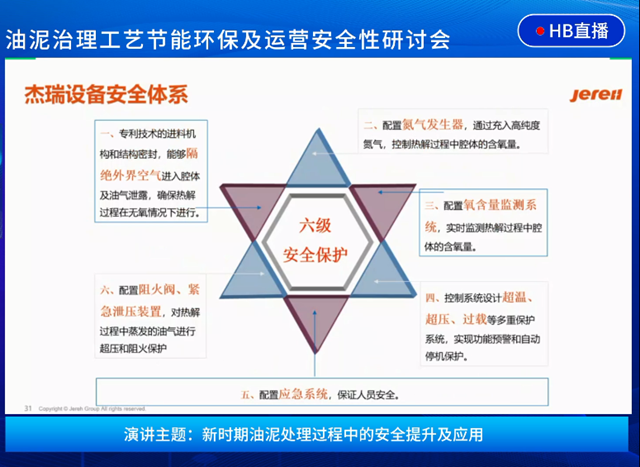 杰瑞設(shè)備“六級(jí)安全保護(hù)”系統(tǒng),從機(jī)械結(jié)構(gòu)密封、氮?dú)獍l(fā)生器、氧含量監(jiān)測(cè)系統(tǒng)、功能預(yù)警和停機(jī)保護(hù)系統(tǒng)、應(yīng)急系統(tǒng)到阻火閥與緊急泄壓裝置,通過(guò)多種技術(shù)手段構(gòu)建起層層防護(hù),來(lái)為油泥處理的安全性把關(guān)。