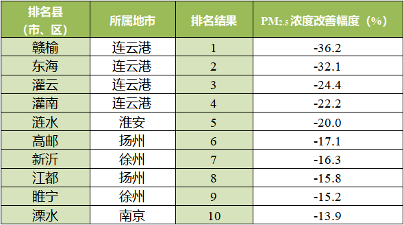 PM2.5濃度改善幅度相對(duì)較好的前10位(1-10名)依次是:贛榆、東海、灌云、灌南、漣水、高郵、新沂、江都、睢寧、溧水
