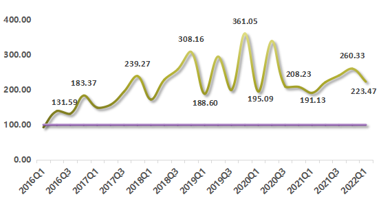 浙江省排污權(quán)交易活躍度呈上下波動走勢。2022年第一季度,浙江省排污權(quán)交易活躍度指數(shù)為223.47點(diǎn),環(huán)比下行14.16%,同比上行16.92%。