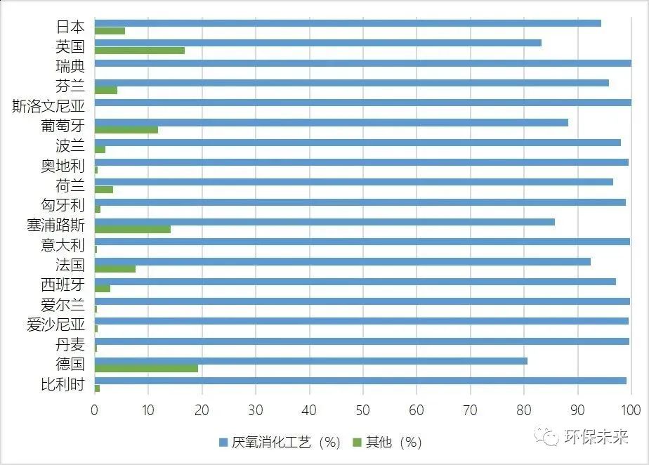 由圖1可以看出,目前發(fā)達(dá)國(guó)家的廚余垃圾處理技術(shù)主要以厭氧消化為主,約占市場(chǎng)份額的9成左右。其主要原因是相比于堆肥等其他處理技術(shù),厭氧消化技術(shù)更加環(huán)保和先進(jìn),受到業(yè)內(nèi)的廣泛關(guān)注,逐步形成一套成熟的產(chǎn)業(yè)鏈,進(jìn)而得到市場(chǎng)的認(rèn)可和推廣。