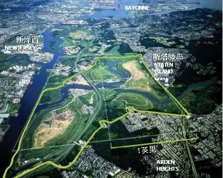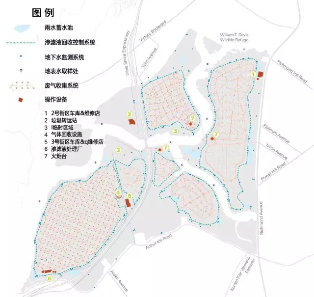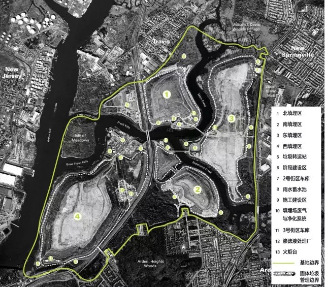 弗萊士河垃圾填埋場位于紐約斯塔滕島(圖3),占地面積超過2200英畝(約8.9k㎡),于1948年投入運(yùn)營,2001年停止接收垃圾。這里曾經(jīng)是世界上最大的垃圾填埋場,也是1990年代紐約市唯一仍在使用的填埋場。隨著1999年弗萊士河更新計劃的啟動,原有填埋場區(qū)陸續(xù)關(guān)閉并封場,直至2001年,填埋場接收了最后一批垃圾——“9?11”事件的世貿(mào)中心建筑廢墟。