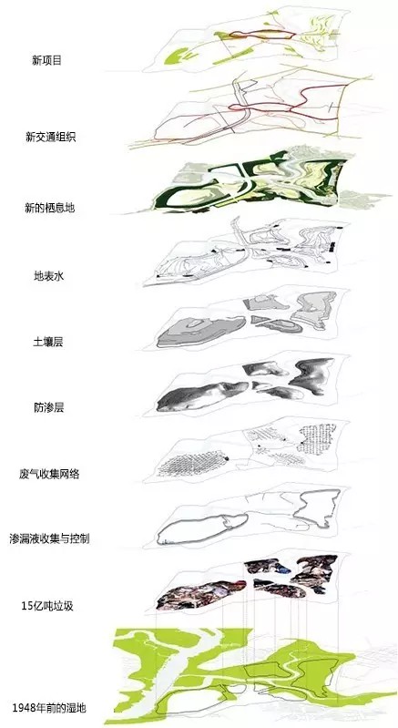 環(huán)境修復(fù)與垃圾防滲是弗萊士河公園改造初期的關(guān)鍵任務(wù),其中運(yùn)用了多層覆蓋技術(shù),收集廢棄物產(chǎn)生的氣體、滲漏液的系統(tǒng)和水質(zhì)檢測系統(tǒng)(圖7,圖8)。場地生態(tài)修復(fù)需達(dá)到嚴(yán)格的標(biāo)準(zhǔn)后方允許啟動各類建設(shè)項目。