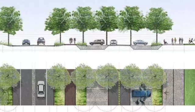 盡管公共交通是公園所在的斯塔滕島鼓勵發(fā)展的交通方式,但在以小汽車為主導(dǎo)的美國城市,短時間內(nèi)轉(zhuǎn)變主要交通方式的可行性較低。因此,公園規(guī)劃包含了適應(yīng)自然環(huán)境的停車設(shè)施規(guī)劃(圖9)。停車場分散于公園內(nèi)的各個主要片區(qū),掩映在線性栽植的樹蔭下,并與停車場周圍的自然環(huán)境相融合。停車場以可滲透性材料鋪設(shè),以減低熱島效應(yīng),并控制地表徑流(圖10)。