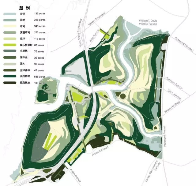 在1948年垃圾填埋場運(yùn)營之前,弗萊士河區(qū)域是哈德遜河河口最大的濕地之一,50多年的垃圾填埋對生態(tài)造成了嚴(yán)重的影響。公園總體規(guī)劃旨在恢復(fù)基地原有的生態(tài)風(fēng)貌與動植物棲息地,并設(shè)立了五個主要目標(biāo):