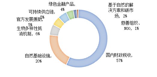 根據(jù)保爾森基金會的統(tǒng)計數(shù)據(jù),2019年全球用于生物多樣性保護的資金約為1240-1430億美元,遠低于為實現(xiàn)到2030年保障生物多樣性水平所需的7220-9670億美元的資金需求,每年的資金缺口約為598-824億美元。在2019年統(tǒng)計的生物多樣性資金中,57%來自國內(nèi)財政稅收,20%來自自然基礎設施投入,6%來源于生物多樣性抵消機制。官方發(fā)展援助和可持續(xù)供應鏈提供的資金比例都為5%,而綠色金融產(chǎn)品提供資金僅占比4%。