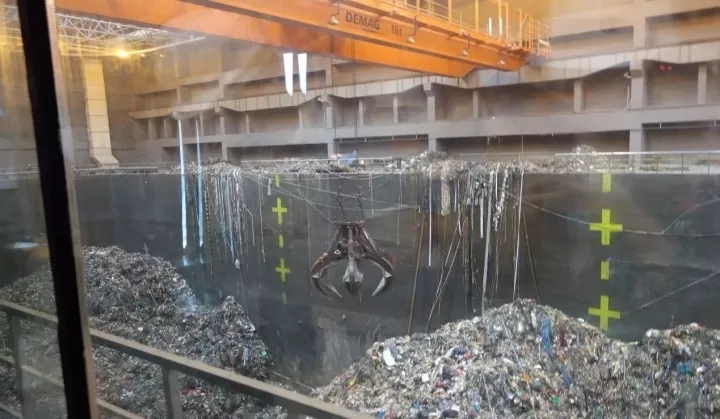 首先,生活垃圾運(yùn)輸車經(jīng)地磅稱重后,由上料坡道進(jìn)入卸料大廳。在垃圾吊控制室的統(tǒng)一指揮下,運(yùn)輸車將垃圾由指定卸料門(mén)卸入垃圾池內(nèi)。垃圾池采用全封閉性設(shè)計(jì),氣壓為負(fù)33pa,有效防止了臭氣外逸。垃圾池上方有四臺(tái)垃圾吊抓斗(三用一備),每臺(tái)容積為12立方米,是目前國(guó)內(nèi)最大的單體抓斗,采用手動(dòng)+半自動(dòng)式操作將抓取的垃圾從池內(nèi)送入進(jìn)料口,進(jìn)入焚燒爐焚燒。