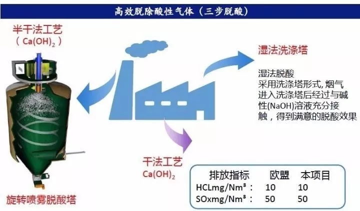 七步法煙氣處理:SNCR(選擇性非催化還原脫硝)+旋轉(zhuǎn)噴霧脫酸塔(添加Ca(OH)2)+干法脫酸+活性炭噴射吸附+布袋除塵器+SGH+SCR(選擇性催化還原脫硝)+濕法脫酸+GGH(煙氣再加熱)