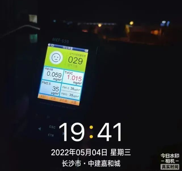 △  上圖說明:居民自購了檢測設(shè)備,測量結(jié)果也證實了他們的擔心。根據(jù)國家相關(guān)標準,室內(nèi)tvoc(總揮發(fā)性有機化合物)值等于或小于0.60mg/m3才算安全,而有居民自行檢測的該值為1.015mg/m3。