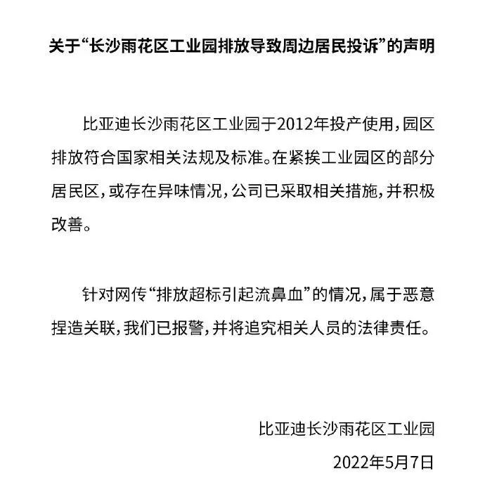 從比亞迪《關(guān)于“長沙雨花區(qū)工業(yè)園排放導(dǎo)致周邊居民投訴”的聲明》中可以看到明顯的推卸責任的意愿和強勢的威懾。