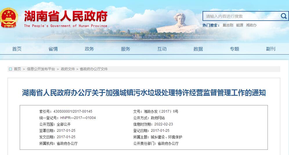 湖南省人民政府辦公廳關(guān)于加強(qiáng)城鎮(zhèn)污水垃圾處理特許經(jīng)營監(jiān)督管理工作的通知