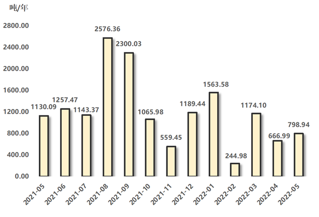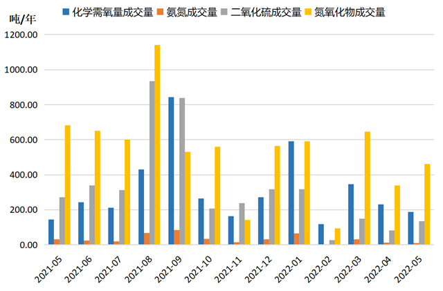 2022年5月,排污權成交量指標環(huán)比、同比走勢相異,四項排污權成交量合計為798.94噸,環(huán)比漲幅為19.78%,與上年同期相比下降29.30%。