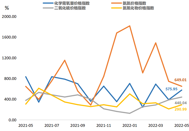 四項排污權指標:化學需氧量指數(shù)為575.95點(對應價格23038.10元/噸·年)、氨氮指數(shù)為649.01點(對應價格25960.20元/噸·年)、二氧化硫指數(shù)為440.04點(對應價格4400.39元/噸·年)、氮氧化物指數(shù)為290.99點(對應價格2909.90元/噸·年)。