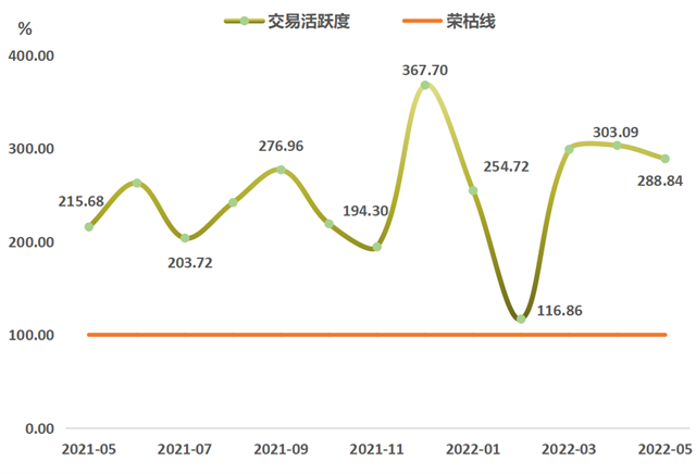 2022年5月,浙江省排污權交易活躍度指數(shù)為288.84點,環(huán)比下行4.70%,與上年同期相比上行33.92%。