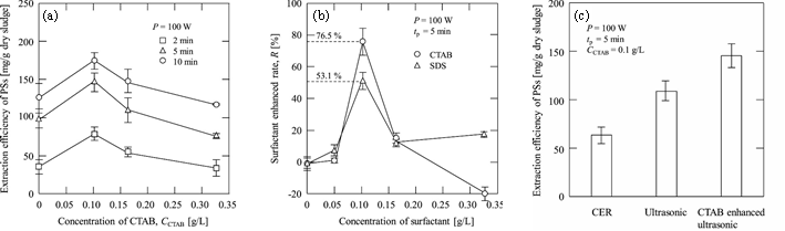 2 不同影響因素的提取效率。(a)不同的脈沖超聲時(shí)間下PSs的提取量與CTAB濃度之間的關(guān)系;(b)CTAB和SDS的添加濃度與表面活性劑強(qiáng)化比之間的關(guān)系;(c)三種方法下剩余污泥中高分子物質(zhì)的提取量(來自原文)
