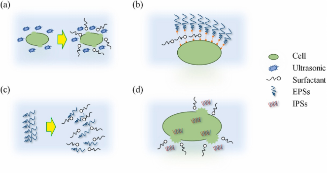 圖3 表面活性劑強(qiáng)化超聲波法提取的四種機(jī)理。(a)降低表面張力;(b)破壞EPSs與細(xì)胞體間的非共價(jià)鍵;(c)相似相溶作用;(d)破壞細(xì)胞壁或細(xì)胞膜結(jié)構(gòu)(來自原文)