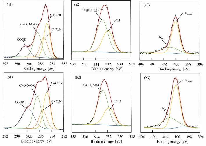 圖6 高分辨率XPS圖。C 1s (a1、b1)、O 1s (a2、b2)和N 1s (a3、b3),PSus(a1~a3)和PSu(b1~b3)(來自原文)