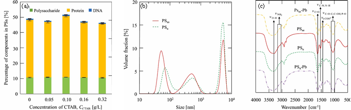 圖4 高分子物質(zhì)的特性分析。(a)多糖、蛋白質(zhì)和DNA的質(zhì)量百分比;(b)PSus和PSu的典型粒度分布;(c)各PSs的FTIR(來自原文)