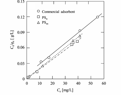 圖7 PSu、PSus和商用吸附劑對(duì)Pb2+的Langmuir吸附等溫線(吸附劑的濃度為60 mg·L-1,Pb2+的初始濃度為0.1~0.6 mmol·L-1,實(shí)驗(yàn)溫度為25℃)(來自原文)