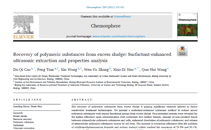 Cao D Q, Tian F, Wang X, Zhang W Y, Hao X D, Wang Q H. Recovery of polymeric substances from excess sludge: Surfactant-enhanced ultrasonic extraction and properties analysis. Chemosphere, 2021, 283: 131181.
