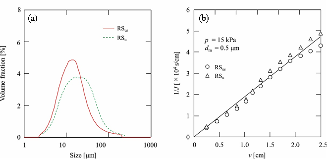 圖8 RSus和RSu的特性。(a)粒度分布;(b)過濾行為(橫軸v表示單位面積上濾過的濾液體積,縱軸1/J表示過濾速率的倒數(shù))(來自原文)