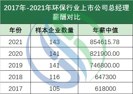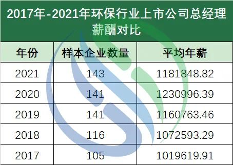 以上趨勢(shì)和環(huán)保行業(yè)整體薪資水平基本保持一致。對(duì)此,中國(guó)水網(wǎng)也曾在《21年平均工資公布!環(huán)保類(lèi)收入排名依然倒數(shù),且增速墊底》一文中分析過(guò)這背后的三層原因:第一,是外部的不確定因素增加。2018年,嚴(yán)控金融風(fēng)險(xiǎn)使財(cái)稅政策和金融政策持續(xù)收緊,以及PPP項(xiàng)目規(guī)范化調(diào)整等,讓企業(yè)面臨新的融資困境,一部分企業(yè)已經(jīng)因此受到了嚴(yán)重打擊。而2020年持續(xù)至今的新冠疫情則將環(huán)境產(chǎn)業(yè)和企業(yè)發(fā)展推向變中之變。疫情的影響在過(guò)去五年環(huán)保上市公司總經(jīng)理年薪對(duì)比數(shù)據(jù)中尤為明顯:2017年到2020年環(huán)保上市公司總經(jīng)理年薪穩(wěn)步上升,從2017年的101.96萬(wàn)元上升至2020年的123.1萬(wàn)元,上升幅度超21萬(wàn)元。到了2020年,受疫情影響,各大環(huán)保企業(yè)面臨停工停產(chǎn)等問(wèn)題,或許是企業(yè)管理層對(duì)未來(lái)預(yù)計(jì)不樂(lè)觀,多家企業(yè)下調(diào)了2021年企業(yè)年薪水平。總經(jīng)理平均年薪由2020年的123.1萬(wàn)元下降至2021年的118.18萬(wàn)元,下降幅度近5萬(wàn)元。▼注:圖中樣本企業(yè)數(shù)量來(lái)源于wind不過(guò)不用慌,從年薪中位數(shù)來(lái)看,環(huán)保行業(yè)過(guò)去5年來(lái)的總經(jīng)理年薪水平還是保持了穩(wěn)定的增長(zhǎng)趨勢(shì),從2017年至2021年,上漲近24萬(wàn)元,增長(zhǎng)達(dá)38.29%。第二,是企業(yè)盈利難度提升。根據(jù)上市環(huán)保企業(yè)已經(jīng)發(fā)布的2021年業(yè)績(jī)情況整體來(lái)看,2021年環(huán)保產(chǎn)業(yè)的盈利水平較2020年有所下降,有多家企業(yè)的凈利潤(rùn)出現(xiàn)了虧損,有約近四成的企業(yè)出現(xiàn)了凈利潤(rùn)的下滑,其中有個(gè)別企業(yè)下滑幅度相對(duì)較大。第三,是民營(yíng)企業(yè)經(jīng)營(yíng)難。國(guó)企大舉接盤(pán)環(huán)保民營(yíng)企業(yè)浪潮的推進(jìn),帶來(lái)了行業(yè)的重新洗牌。在經(jīng)濟(jì)下行壓力下,國(guó)際形勢(shì)的不確定性、疫情的反復(fù)等等因素都為民營(yíng)企業(yè)的經(jīng)營(yíng)帶來(lái)了挑戰(zhàn)。證券市場(chǎng)風(fēng)云變幻