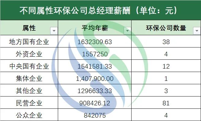 “固廢>水務(wù)”這一趨勢(shì)和過(guò)去兩年的環(huán)保上市公司業(yè)績(jī)趨勢(shì)一致。中國(guó)水網(wǎng)2020年與2021年的環(huán)保上市公司年報(bào)數(shù)據(jù)統(tǒng)計(jì)結(jié)果顯示,連續(xù)兩年,固廢處置行業(yè)的營(yíng)業(yè)收入與凈利潤(rùn)雙雙超過(guò)水務(wù)行業(yè)。近兩年隨著《“十四五”城鎮(zhèn)生活垃圾分類(lèi)和處理設(shè)施發(fā)展規(guī)劃》、《“十四五”循環(huán)經(jīng)濟(jì)發(fā)展規(guī)劃》、《“十四五”時(shí)期“無(wú)廢城市”建設(shè)工作方案》等政策的出臺(tái),帶動(dòng)了固廢處置行業(yè)中環(huán)衛(wèi)、餐廚垃圾處理等細(xì)分領(lǐng)域的發(fā)展,從而在一定程度上影響了固廢處置行業(yè)環(huán)保上市公司總經(jīng)理們的年薪水平。不過(guò)水務(wù)行業(yè)的環(huán)保企業(yè)也不用太焦慮。進(jìn)入“十四五”時(shí)期以來(lái),《關(guān)于推進(jìn)污水資源化利用的指導(dǎo)意見(jiàn)》、《“十四五”城鎮(zhèn)污水處理及資源化利用發(fā)展規(guī)劃》等一系列關(guān)于污水固廢資源化的政策頻繁出臺(tái)。在新建水務(wù)項(xiàng)目越來(lái)越少的情況下,國(guó)家也多次出臺(tái)措施助推存量資產(chǎn)盤(pán)活,為水務(wù)企業(yè)發(fā)展提供新的思路。此外,從事大氣治理、環(huán)保裝備制造、土壤修復(fù)與環(huán)境監(jiān)測(cè)等細(xì)分領(lǐng)域的企業(yè)隨著近年來(lái)國(guó)家政策的出臺(tái),乘著政策紅利的東風(fēng),其市場(chǎng)規(guī)模也日益突顯,相繼迎來(lái)發(fā)展高峰。如,《2021-2030年大氣污染治理行業(yè)發(fā)展展望報(bào)告》數(shù)據(jù)顯示,預(yù)計(jì)2021-2025年大氣污染治理市場(chǎng)規(guī)模約為1.6-1.8萬(wàn)億元;在環(huán)保裝備制造領(lǐng)域,工信部、科技部、生態(tài)環(huán)境部三部門(mén)于今年1月21日聯(lián)合印發(fā)的《環(huán)保裝備制造業(yè)高質(zhì)量發(fā)展行動(dòng)計(jì)劃》提出,到2025年,環(huán)保裝備制造業(yè)產(chǎn)值要力爭(zhēng)達(dá)到1.3萬(wàn)億元;再如第三方環(huán)境監(jiān)測(cè)運(yùn)營(yíng)市場(chǎng)也逐步釋放,2021年上半年共注冊(cè)5.0萬(wàn)家環(huán)境監(jiān)測(cè)類(lèi)企業(yè),同比增長(zhǎng)72.4%……種種政策和市場(chǎng)需求創(chuàng)造的紅利為這些細(xì)分領(lǐng)域帶來(lái)了積極因素。無(wú)論管理層還是普通員工,都是企業(yè)發(fā)展的一個(gè)“齒輪”,個(gè)人收入的多少都與企業(yè)經(jīng)營(yíng)狀況掛鉤。環(huán)境產(chǎn)業(yè)各細(xì)分領(lǐng)域市場(chǎng)潛力的釋放與從業(yè)者薪資水平正如月球牽引著潮汐,潮漲潮落,有跡可循。筆者按照wind的分類(lèi),將143家環(huán)保公司分為中央國(guó)有企業(yè),地方國(guó)有企業(yè)、集體企業(yè)、民營(yíng)企業(yè)、公眾企業(yè)、外資企業(yè)和其他企業(yè)七大類(lèi)。根據(jù)統(tǒng)計(jì)數(shù)據(jù)顯示,地方國(guó)有企業(yè)以163.23萬(wàn)元的總經(jīng)理平均年薪位列第一,外資企業(yè)和中央國(guó)有企業(yè)分別位列第二、三位,其總經(jīng)理平均年薪分別為155.73萬(wàn)元和154.16萬(wàn)元。前三整體年薪水平差距不大。