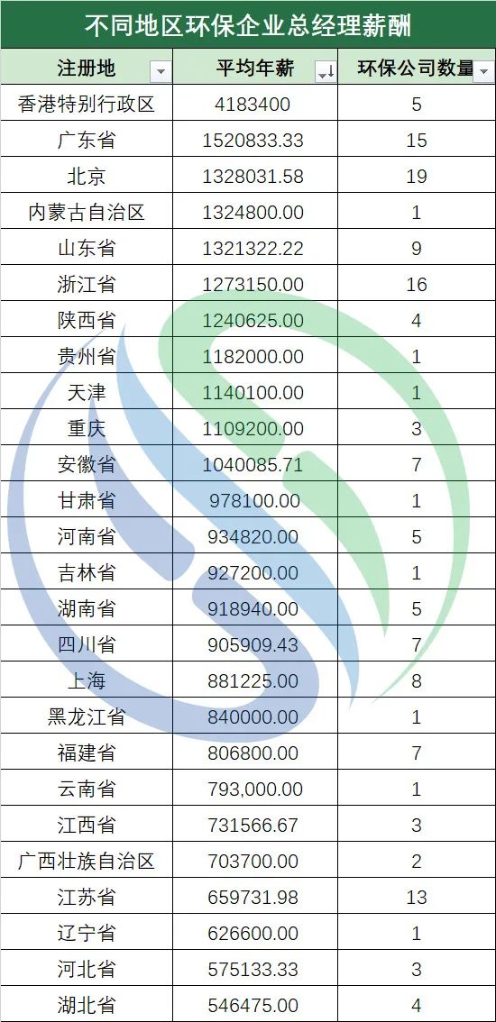 按照上市板塊來(lái)看,筆者根據(jù)wind分類(lèi)結(jié)果,將143家環(huán)保上市公司劃分為主板(包括港股)、科創(chuàng)板、創(chuàng)業(yè)板、北交所四大板塊。根據(jù)各大板塊環(huán)保上市公司總經(jīng)理平均年薪水平來(lái)看,在主板上市的環(huán)保公司們以約145.46萬(wàn)元的總經(jīng)理平均年薪遙遙領(lǐng)先,平均年薪高于第二名近50萬(wàn)元,科創(chuàng)板和創(chuàng)業(yè)板位列第二、三名,總經(jīng)理平均年薪分別約為96.98萬(wàn)元和89.91萬(wàn)元,差距不是很大。剛剛成立不滿(mǎn)一年,上市企業(yè)數(shù)量有限的北交所則以76.29萬(wàn)元的總經(jīng)理平均年薪排名第四。主板創(chuàng)立時(shí)間悠久,以傳統(tǒng)產(chǎn)業(yè)為特點(diǎn),上市企業(yè)大多具有市場(chǎng)占有率高、規(guī)模大、基礎(chǔ)好等特點(diǎn),平均年薪排名第一并不意外。科創(chuàng)板、創(chuàng)業(yè)板以及去年正式成立的北交所則以技術(shù)、創(chuàng)新為特色,為中小企業(yè)提供了多種融資渠道,這三大板塊的總經(jīng)理年薪排名也合乎現(xiàn)實(shí)情況。值得注意的是,近兩年瞄準(zhǔn)科創(chuàng)板、創(chuàng)業(yè)板、北交所登陸資本市場(chǎng)的環(huán)保企業(yè)數(shù)量逐步增多。據(jù)中國(guó)水網(wǎng)相關(guān)數(shù)據(jù)統(tǒng)計(jì)顯示,2021年,43家上市環(huán)保企業(yè)中,在創(chuàng)業(yè)板上市的環(huán)保公司有19家,在科創(chuàng)板上市的環(huán)保公司有10家,分列2021年環(huán)保公司上市渠道前二。兩大板塊作為“潛力股”,未來(lái)其業(yè)績(jī)能力值得關(guān)注,總經(jīng)理年薪水平或許也將水漲船高。再?gòu)?strong style="margin: 0px;padding: 0px;outline: 0px;box-sizing: border-box !important;overflow-wrap: break-word !important;">企業(yè)注冊(cè)地方面來(lái)看,中國(guó)水網(wǎng)所統(tǒng)計(jì)的143家環(huán)保上市公司分別來(lái)自26個(gè)省、市、自治區(qū)和特別行政區(qū)。其中,注冊(cè)地位于香港的環(huán)保上市公司總經(jīng)理平均年薪約為418.34萬(wàn)元,遠(yuǎn)高于其它地區(qū),奪得地區(qū)冠軍。廣東、北京緊隨其后,分別以152.08萬(wàn)元與132.8萬(wàn)元位列第二、三名。可以看出,前三地區(qū)的環(huán)保公司年薪水平與地方經(jīng)濟(jì)發(fā)展水平基本保持一致。在統(tǒng)計(jì)范圍內(nèi),內(nèi)蒙古僅一家環(huán)保上市公司,受此影響排名第四,成為特例之一。特例之二是江蘇省,江蘇宜興作為環(huán)保之鄉(xiāng),是環(huán)境產(chǎn)業(yè)的搖籃,多家知名環(huán)保企業(yè)曾與宜興結(jié)下緣分,但其總經(jīng)理平均年薪排名倒數(shù)第四,薪資并不算太高。觀察發(fā)現(xiàn),注冊(cè)地位于江蘇的13家企業(yè)中,多有從事環(huán)保技術(shù)、環(huán)保設(shè)備的企業(yè),體量不大但數(shù)量眾多也是宜興乃至江蘇省環(huán)保企業(yè)的特征之一,這也在一定程度上影響了總經(jīng)理們的年薪水平。由于香港環(huán)保企業(yè)表現(xiàn)亮眼,筆者從上市地點(diǎn)角度對(duì)港股市場(chǎng)環(huán)保企業(yè)和A股市場(chǎng)環(huán)保企業(yè)的總經(jīng)理年薪水平也進(jìn)行了分析:先回顧A股環(huán)保公司總經(jīng)理年薪水平,126家環(huán)保企業(yè)總經(jīng)理平均年薪約為103.18萬(wàn)元,年薪中位值約為84.2萬(wàn)元。17家港股環(huán)保上市公司總經(jīng)理平均年薪約為229.41萬(wàn)元,是A股環(huán)保企業(yè)的兩倍有余。年薪最高的一家港股環(huán)保公司總經(jīng)理年薪超過(guò)了1200萬(wàn)元,第二、第三名也都超過(guò)了400萬(wàn)元,最低的一家為15萬(wàn)元左右,年薪水平相差較大。港股17家環(huán)保公司年薪中位值約為169.3萬(wàn)元。同時(shí),筆者發(fā)現(xiàn),這些港股環(huán)保公司大多來(lái)自香港、廣東、北京等經(jīng)濟(jì)水平較發(fā)達(dá)的地區(qū)。可看出,港股環(huán)保上市公司總經(jīng)理年薪整體水平較A股更高,但內(nèi)部存在較大懸殊,相當(dāng)一部分港股環(huán)保公司和A股市場(chǎng)環(huán)保公司總經(jīng)理年薪水平較接近。如果僅憑以上信息,就斷言A股上市公司總經(jīng)理的收入不如港股上市公司,卻是錯(cuò)誤的。這是因?yàn)锳股和港股總經(jīng)理的收入差異主要來(lái)源于披露準(zhǔn)則不同。A股披露依據(jù)證監(jiān)會(huì)頒布的《公開(kāi)發(fā)行證券的公司信息披露內(nèi)容與格式準(zhǔn)則第2號(hào)年度報(bào)告的內(nèi)容與格式》。其中明確:“將獲得的股權(quán)激勵(lì)按照可行權(quán)股數(shù)、已行權(quán)數(shù)量、行權(quán)價(jià)以及報(bào)告期末市價(jià)單獨(dú)列示,”即A股披露的總經(jīng)理年薪中不包括股權(quán)激勵(lì)部分。而港股披露的年薪中必須包括股權(quán)激勵(lì)的賬面變化。哪行賺錢(qián)?