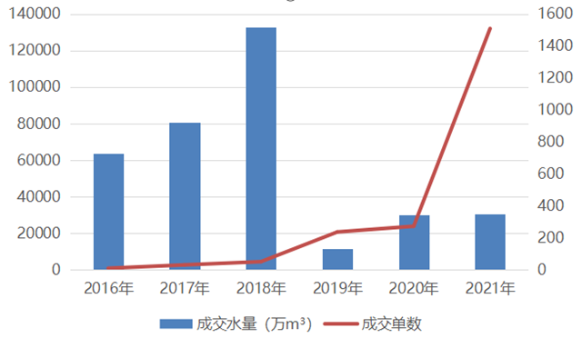 整體而言,2021年成交水量約3億立方米,與2020年成交水量基本相同;同時(shí)成交單數(shù)大幅增長(zhǎng),由2020年的273筆大幅提高至1510筆,顯示交易活躍度顯著改善,覆蓋范圍進(jìn)一步擴(kuò)大。