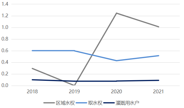 從成交價(jià)格來(lái)看,2021年三種交易類型相比2020年變化均不大,區(qū)域水權(quán)交易雖從約1.2元/方跌至約1.0元/方,但仍然大幅高于其它交易類型;取水權(quán)交易從約0.4元/方小幅上漲至約0.5元/方;灌溉用水戶交易自2018年來(lái)均保持在約0.1元/方的價(jià)格水平。不同交易類型之間的價(jià)格差異仍然明顯。