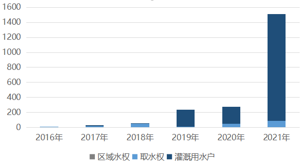 水權(quán)交易包含三種類型:區(qū)域水權(quán)、取水權(quán)和灌溉用水戶交易。其中,區(qū)域水權(quán)交易為政府主導(dǎo),交易主體通常為地方政府或水庫(kù)等,實(shí)現(xiàn)水資源跨區(qū)域調(diào)配,通常規(guī)模最大;取水權(quán)交易為用水主體主導(dǎo),包括企業(yè)等各類型對(duì)取水有需求的單位,規(guī)模較大;灌溉用水戶交易多為農(nóng)戶向村委會(huì)購(gòu)買水權(quán)或村組之間交易水權(quán),規(guī)模較小。