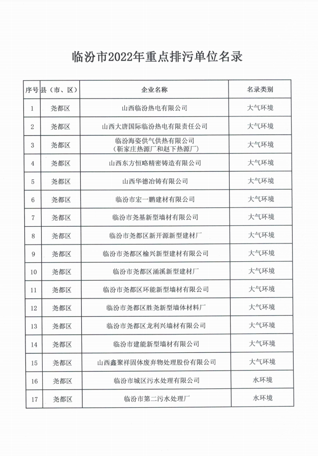 原標(biāo)題:關(guān)于公布臨汾市2022年重點(diǎn)排污單位名錄的通知
