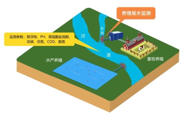 養(yǎng)殖尾水在線監(jiān)測(cè)系統(tǒng)應(yīng)用場(chǎng)景包括水產(chǎn)養(yǎng)殖及畜牧養(yǎng)殖等。主要監(jiān)測(cè)養(yǎng)殖活動(dòng)過(guò)程中產(chǎn)生的向外環(huán)境排放不再使用的廢水。