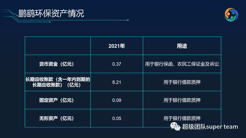 截至2021年底,鵬鷂環(huán)保貨幣現(xiàn)金有4.47億,但短期借款有6.77億,長期借款有7.18億,還有一年內(nèi)到期的長期借款有1.2億,貨幣現(xiàn)金只能覆蓋短期還款。鵬鷂環(huán)保多個(gè)資產(chǎn)科目還存在抵押或質(zhì)押的情況,受限資產(chǎn)金額約15億,占總資產(chǎn)比例約1/2。