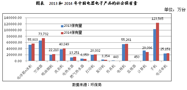 廢棄電器電子產(chǎn)品理論報廢量的測算為行業(yè)管理提供重要的依據(jù)。根據(jù)國家統(tǒng)計年鑒電器電子產(chǎn)品居民百戶擁有量與居民戶數(shù)測算的居民保有量見下圖。除固定電話和黑白電視機之外,其他產(chǎn)品均逐年增長,其中移動電話的增長速度最高。中投顧問發(fā)布的《2017-2021年中國電子廢棄物處理行業(yè)深度調(diào)研及投資前景預(yù)測報告》指出,2013和2014年中國電器電子產(chǎn)品的社會保有量持續(xù)上升,社會保有量是根據(jù)電器電子產(chǎn)品銷量與對于該年報廢系數(shù)乘積的方法進行的測算。