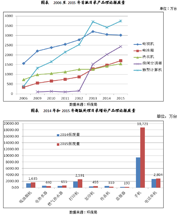 2015年首批目錄產(chǎn)品的理論報廢量增幅放緩,同比增加9.32%。在政策激勵下,從2013年開始,電冰箱、洗衣機、房間空調(diào)器和微型計算機的理論報廢量逐年上漲,但電視機的理論報廢量小幅下降。2015年,新增目錄產(chǎn)品中手機的理論報廢量同比增加約50%。