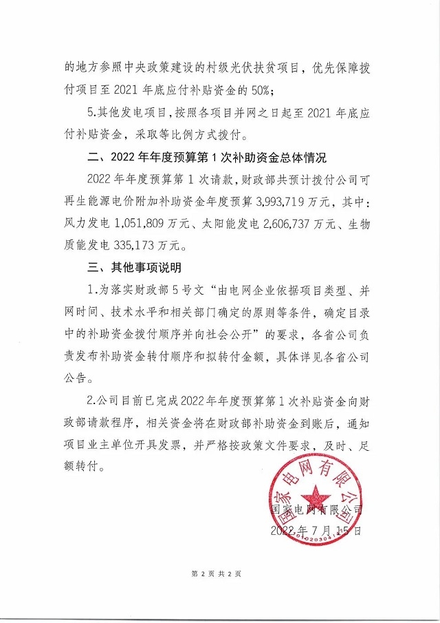 2022年7月15日,國家電網(wǎng)微信平臺發(fā)布“關(guān)于2022年年度預算第1次可再生能源電價附加補助資金撥付情況的公告”,提到將對納入補貼或清單且滿足結(jié)算條件的各類項目進行及時、足額轉(zhuǎn)付。