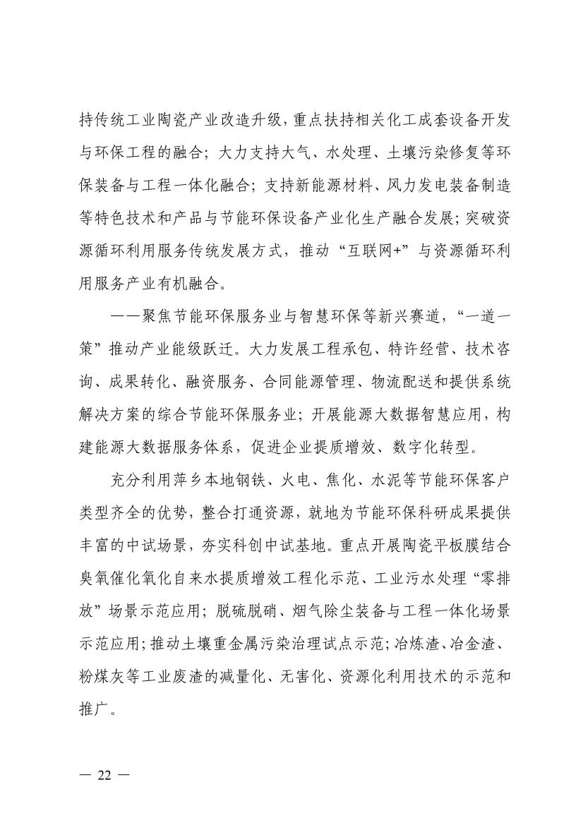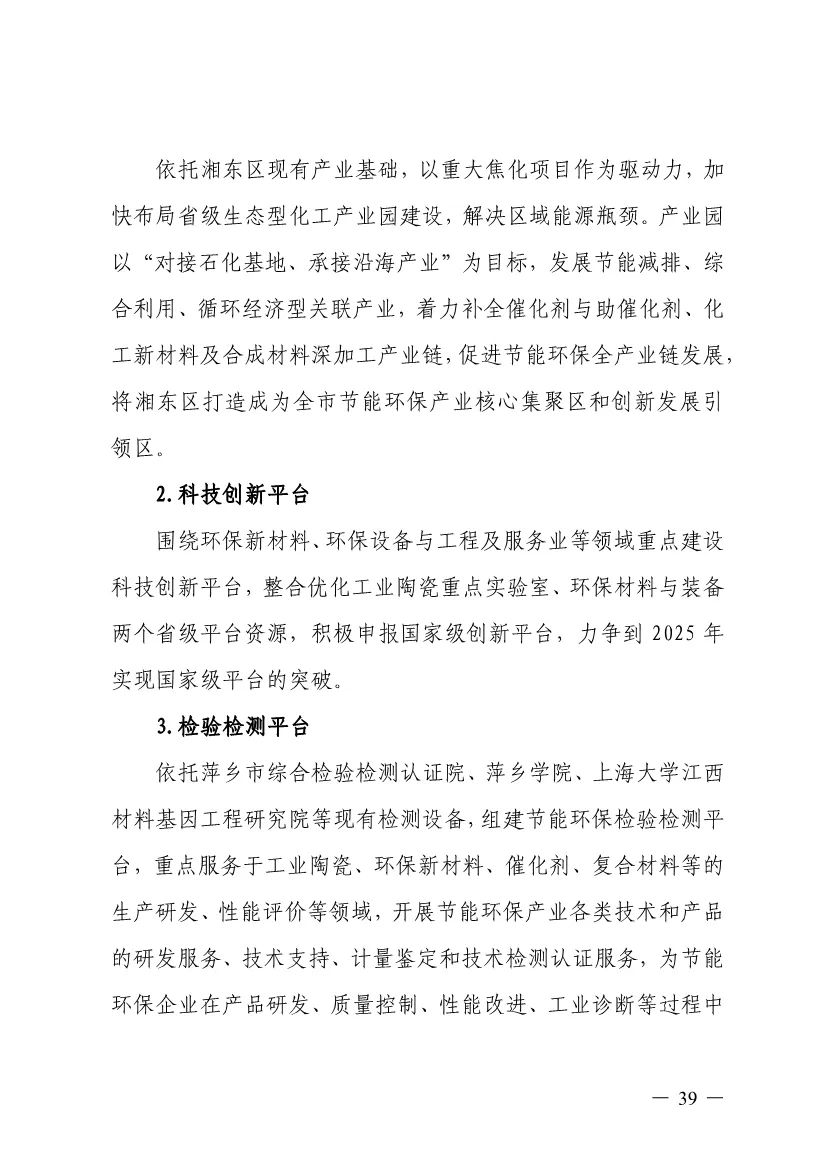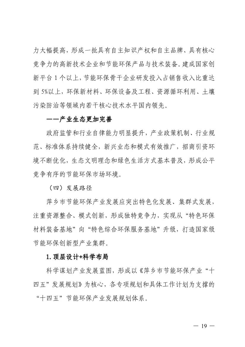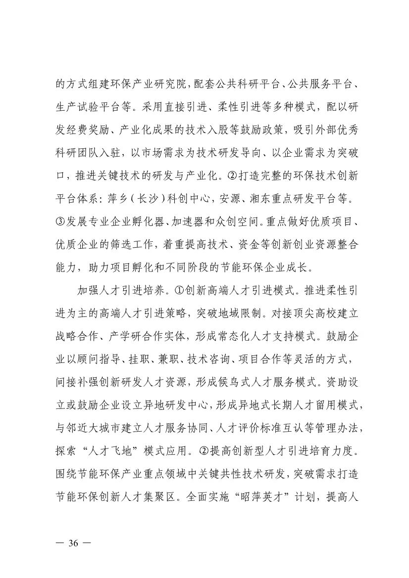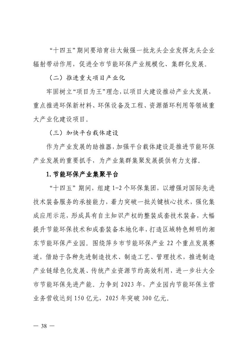 “十四五”期間,組建1-2個環(huán)保集團,以增強對國際先進技術裝備服務的承接能力,著力突破一批關鍵核心技術,強化集成應用示范,形成具有自主知識產(chǎn)權的整裝成套技術裝備,大幅提升節(jié)能環(huán)保技術和成套裝備本地化率,打造區(qū)域特色鮮明的湘東節(jié)能環(huán)保產(chǎn)業(yè)園。